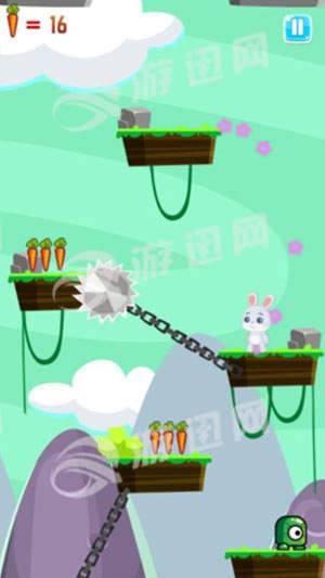 3、玩家通过跳跃来不断的冒险,利用跳跃去不同的平台上收集胡萝卜哦!