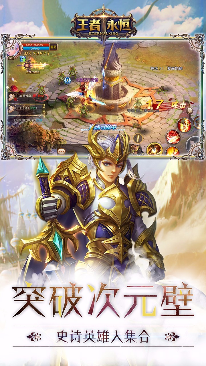 王者永恒是以魔幻题材背景制作的多人在线ARPG游戏,游戏中角色养成,装备强化,创新玩法的副本,欢迎喜欢的小伙伴下载试玩!