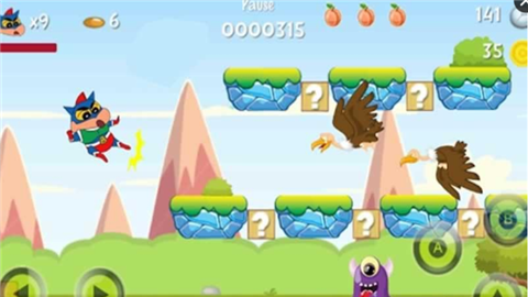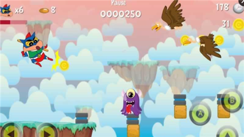 大家耳熟能详的新之助化身正义的使者动感超人吗,你需要穿越重重危机,沿途帮助小新收集他最喜欢的点心小熊饼干并且打败怪物解救被抓走的公主。喜欢新酱的小朋友赶紧下载来玩吧!