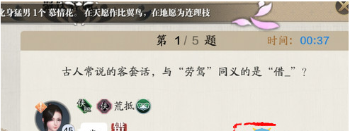 天涯明月刀古人常说的客套话,与“劳驾”同义的是“借_”什么?相信小伙伴们都很想知道吧,下面就让红鼠网小编就带大家了解一下相关攻略吧,感兴趣的小伙伴们速来围观吧~~ 《天涯明月刀》手游古人常说的客套话,与“劳驾”同义的是“借_” 答案:光 帮派聚饮怎么玩 1、加入帮派 2、每天都有 3、固定时间19:30-20:00 聚饮的时候,需要击杀一次太白逸侠,别忘记了。 完成3个任务,可以获得奖励。