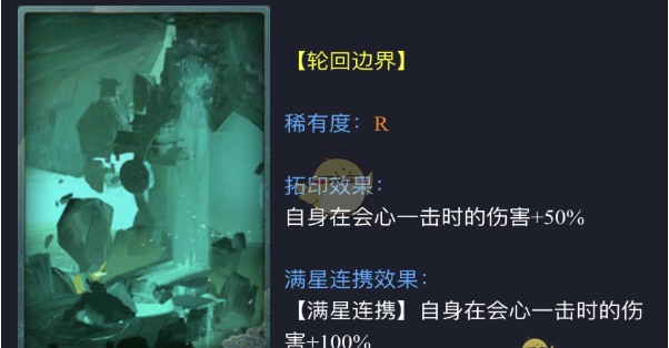 神都夜行录拓印轮回边界属性怎么样?相信小伙伴们都很想知道吧,下面就让红鼠网小编就带大家了解一下吧,感兴趣的小伙伴们速来围观吧~~ 【轮回边界】 稀有度:R 升星前效果: 自身在会心一击时的伤害+50% 满星连携效果: 自身在会心一击时的伤害+100% 拓印点评: 这款拓印属性还是可以的,配置后能够为妖灵师带来气血的增加,同时还会提高攻击伤害。 虽然是R级拓印,但是配置后还会有特殊的效果