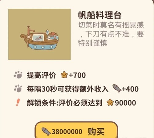 动物餐厅帆船料理台设施怎么解锁?相信小伙伴们都很想知道吧,下面就让红鼠网小编就带大家了解一下相关攻略吧,感兴趣的小伙伴们速来围观吧~~帆船料理台怎么解锁:帆船料理台简介:切菜时莫明有摇晃感,下刀有点不准,要特别谨慎。提高评价:加700星每隔30s可获得额外收入 加400小鱼干解锁条件:评价必须达到90000星38000000小鱼干购买以上就是动物餐厅帆船料理台设施解锁攻略的全部内容,更多《动物餐厅