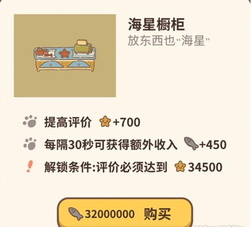 动物餐厅海星橱柜设施怎么解锁?下面红鼠网小编为大家带来了相关攻略,想必小伙伴们都很感兴趣吧,那么就快随小编一起来看看相关介绍吧!海星橱柜怎么解锁:海星橱柜简介:放东西也“海星”。提高评价:加700星每隔30s可获得额外收入 加450小鱼干解锁条件:评价必须达到34500星32000000小鱼干购买以上就是动物餐厅海星橱柜设施解锁攻略的全部内容,更多《动物餐厅》相关攻略,敬请关注红鼠网!