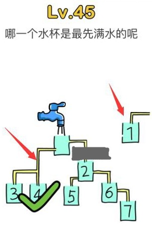 有很多小伙伴们都不知道《脑洞大师》第45关通关攻略,那么下面就由小编来为大家带来的相关攻略吧,希望能够帮助到大家,感兴趣的朋友往下看吧~ 脑洞大师第45关通关攻略 问题: 哪一个水杯是最先满水的呢 答案: 1号那个是假的,先将其移开,然后选择4号。 有陷阱哦。脑洞大师相关攻略推荐:脑洞大师第58关通关攻略脑洞大师第29关怎么通关脑洞大师第30关通关攻略以上就是小编为大家带来