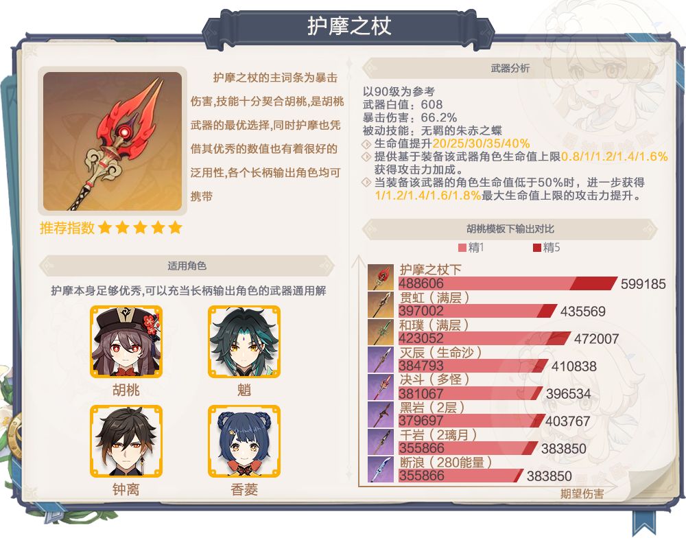 护摩之杖可谓现今最有价值的五星长枪武器,不仅十分契合胡桃,而且给其他长柄输出角色使用都有很不错的效果,泛用性很强。如果打算培养长柄角色很建议抽护摩之杖。
