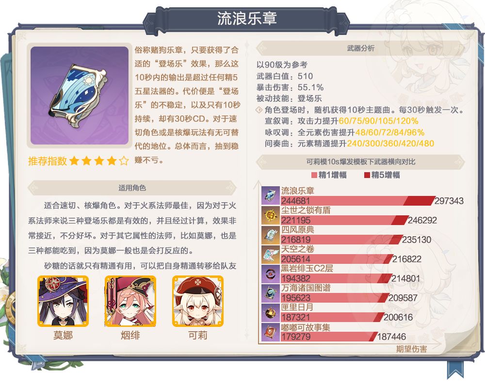 俗称“赌狗乐章”,但对于火系法师就是另一回事了,因为行秋的存在可以让精通的登场乐也发挥显著的效果,最终计算结果显示,对于高增幅覆盖率的火系法师,3中登场乐的最终伤害基本一致,也就是哪个都有用,还是非常顶的。