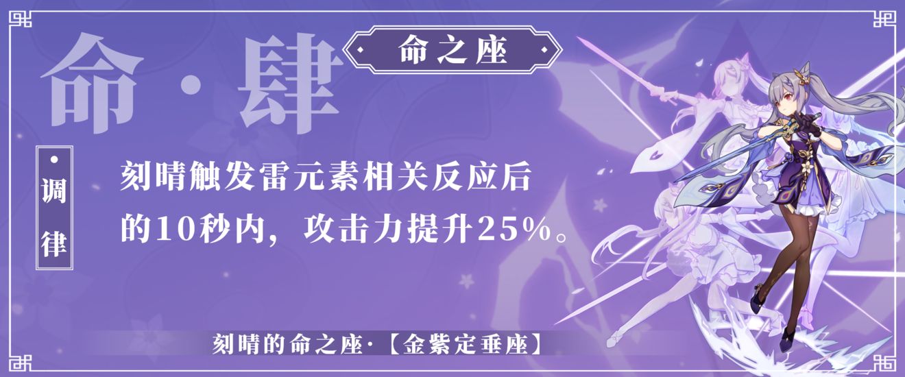 该命座的加成叠加效果同理于公子的专属武器冬极白星,不过刻晴的6命加的是雷元素伤害加成,一共可以叠加24%的雷伤加成,而冬极白星叠加的是攻击力加成。这二者叠加方式一模一样,都是需要施放普攻、重击、元素战技和元素爆发,且四者叠加的层数与持续时间分别单独存在,少放一个技能就少叠加一层。