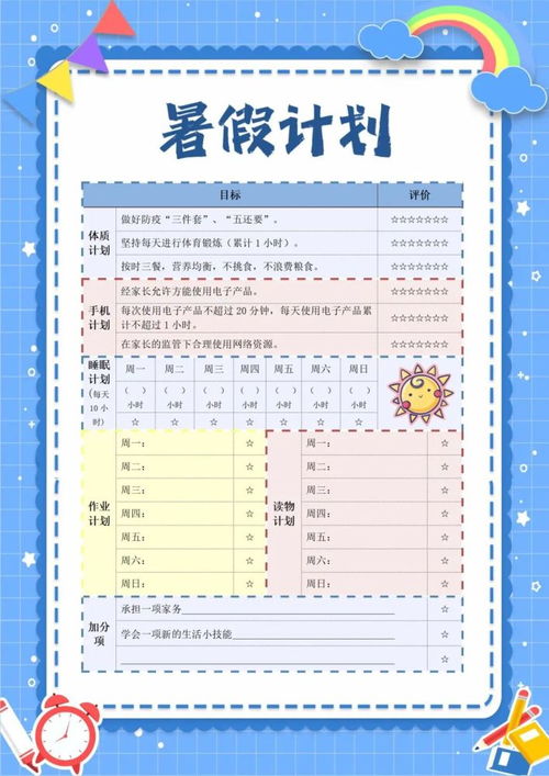 随着学期的结束,期待已久的暑假如约而至,这是自我提升、探索兴趣、放松身心的大好时机。然而,一个无规划的暑假往往容易让人在懒散中虚度光阴。因此,制定一份科学合理的暑假计划表至关重要。下面,就让我们一步步来探索如何制定一份既充实又有趣的暑假计划表吧!1.明确目标,